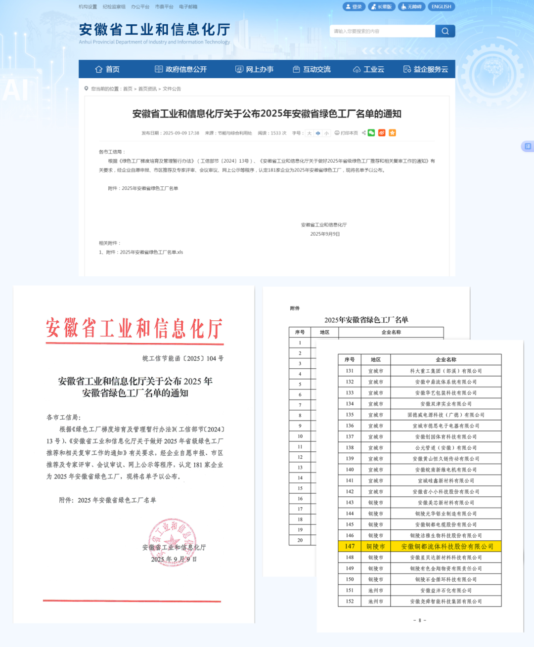 近日,安徽省工業和信息化廳正式公布2025年安徽省綠色工廠名單,銅都流體憑借低碳生產、綠色制造等方面的卓越表現成功入選。